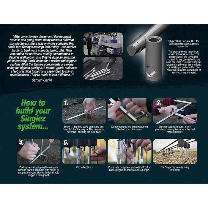 Net als alle producten uit de Singlez range, is de Korda Singlez Upright ontwikkeld door JAG. Het vinden van een ontwikkelaar voor dit systeem was een van de lastigste problemen waar het Korda team tegenaan liep. Het team wilde er absoluut zeker van zijn dat de Singlez range een goede duurzaamheid zou bieden, het was echter de truc om hierbij geen offers proberen te maken op het gebied van precisie en kosten voor de consument. Toen het Korda team het team van JAG ontmoette, wisten ze waar ze moesten zijn. JAG is een RVS expert en produceert zijn volledige range thuis in Engeland. Hierdoor was het voor Korda mogelijk om een oogje in het zeil te houden tijdens het volledige productieproces zodat de Singlez perfect gefabriceerd konden worden.